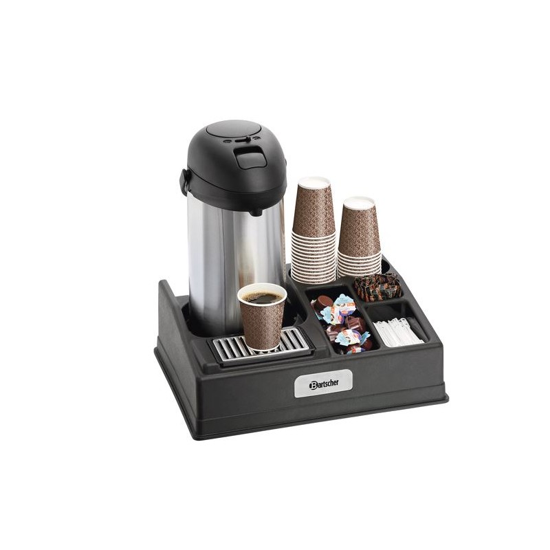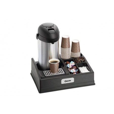 Présentoir à café, 1190 : Sobre et élégant, ce présentoir à café vous permettra de mettre un thermos à café à disposition lors de vos sessions de formations ou réunions commerciales. Pratique, ce présentoir est divisé en plusieurs sections. Ainsi, il vous aidera à disposer méthodologiquement vos gobelets, sucre, touillettes, et crèmes. Muni d'une grille en inox, il évitera les traces de gouttes à gouttes et vous permettra de le nettoyer facilement.Descriptif :