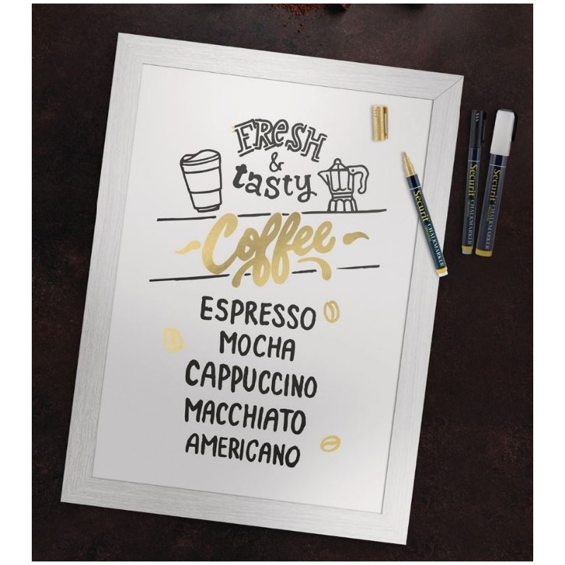 Securit® Woody ardoise blanche- Bois finition laqué blanc - feutres-craie noir et or + kit de montage inclus - 30x40cm