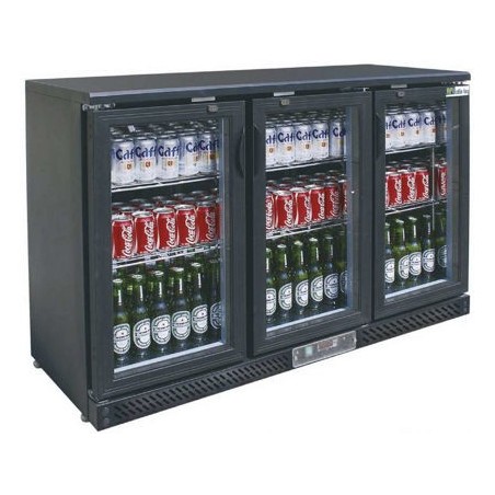 - Arrière-bar 3 portes vitrées battantes, à carrosserie skinplate et intérieur aluminium avec dégivrage et évaporation automatiques. Idéal pour une conservation entre +2°C et +10°C. Gaz réfrigérant R600A. Arrière-bar groupe logé (en bas) et fermeture à clef. Cet arrière-bar est constitué d'une épaisseur d'isolation de 32,5 mm et possède un évaporateur ventilé, un éclairage intérieur ainsi qu'un thermostat électronique.