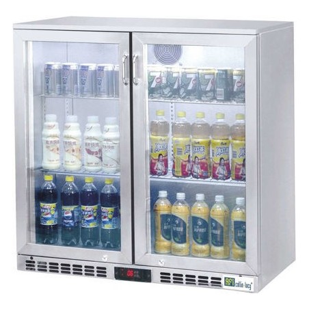 - Arrière-bar 2 portes vitrées battantes, extérieur en acier inoxydable, intérieur en aluminium gaufré. Idéal pour une conservation entre +0°C et +8°C. Gaz réfrigérant R600a. Muni d'un système de refroidissement assisté par ventilateur. Cet arrière-bar est constitué d'un thermostat numérique amovible, d'une porte à fermeture automatique, d'une lumière LED intérieure et de pieds réglables. Pour une sécurité optimale, cet arrière-bar se compose également d'un verre trempé double couche et d'une serrure.