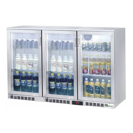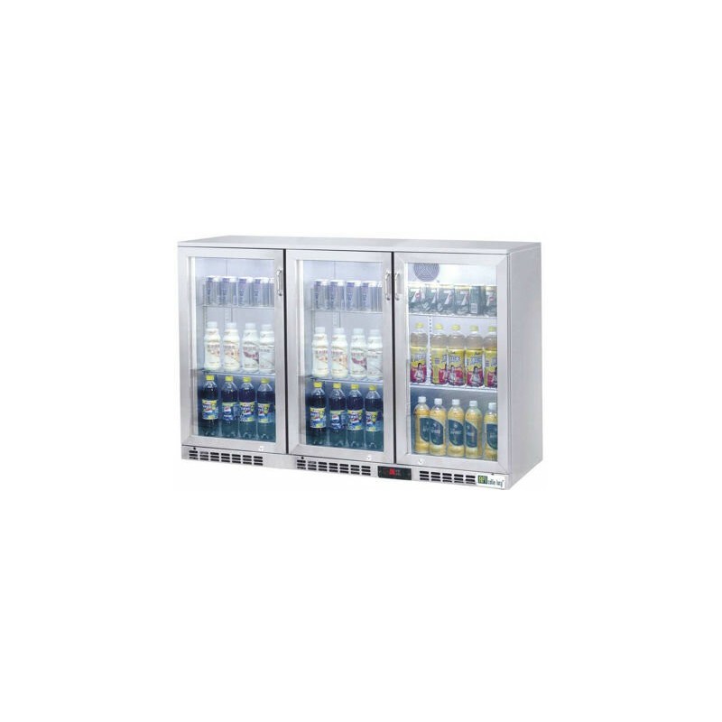 - Arrière-bar 3 portes vitrées battantes, extérieur en acier inoxydable, intérieur en aluminium gaufré. Idéal pour une conservation entre +0°C et +8°C. Gaz réfrigérant R600a. Muni d'un système de refroidissement assisté par ventilateur. Cet arrière-bar est constitué d'un thermostat numérique amovible, d'une porte à fermeture automatique, d'une lumière LED intérieure et de pieds réglables. Pour une sécurité optimale, cet arrière-bar se compose également d'un verre trempé double couche et d'une serrure.