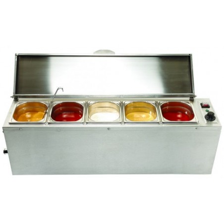 Ce bain marie à sauce possède une vanne de vidange avec un couvercle escamotable. Grâce à son thermostat de 0°C à 100°C et son thermostat de sécurité, ce bain marie professionnel conviendra pour le maintien en température de vos sauces. Sur ce bain marie à sauce professionnel, vous pouvez mettre jusqu'à 5 sauces différentes. La cuve pour bacs GN 1/6 est d'une profondeur de 150 mm (les bacs sont vendus séparément).