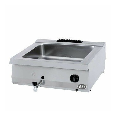 - Bain-marie gaz à poser avec remplissage manuel de la cuve. La cuve emboutie et la partie supérieure de l’appareil forment un dessus monobloc. Ce bain-marie se compose d’un robinet de vidange avec un système de sécurité en façade et d’un thermostat de sécurité qui permet d’éviter tout problème lié à une surchauffe de l’appareil. Le thermostat peut ajuster la température de l’eau jusqu’à 90°C. Les brûleurs en acier inoxydable situés sous la cuve garantissent une rapide montée en température de l’eau.