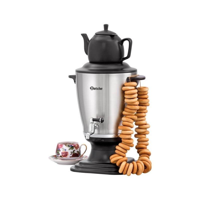 Samovar appellé aussi théière ou passoire à thé.Ce Samovar est destiné à infuser du thé ainsi que d'autres boissons chaudes et boissons instantanées.Ne pas utiliser le Samovar pour chauffer du lait ou des liquides moussants, chauffer de la soupe ou des sauces, pour chauffer ou préparer des liquides contenant du sucre ou de l'alcool.Ce Samovar possède des poignées isolées contre la chaleur et d'un arrêt automatique.