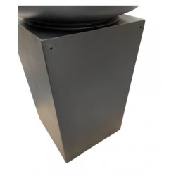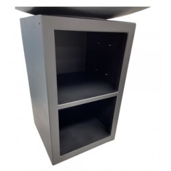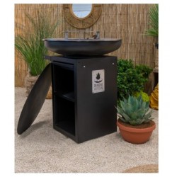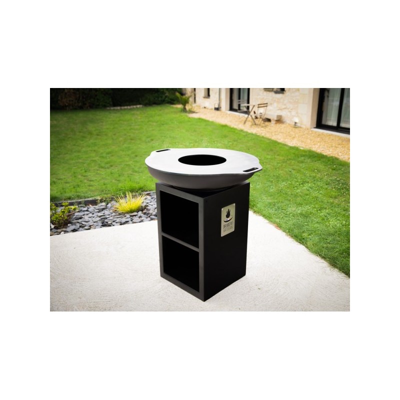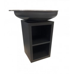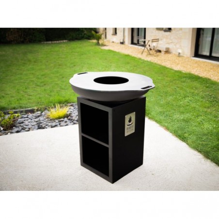 Son meuble monobloc peint en noir ou en acier brut corten d'une hauteur de 835 mm vous permet de stocker votre bois à l'abri et de recharger votre brasero lors de son utilisation. L'étagère intermédiaire se trouve à 445 mm de la base du meuble.
