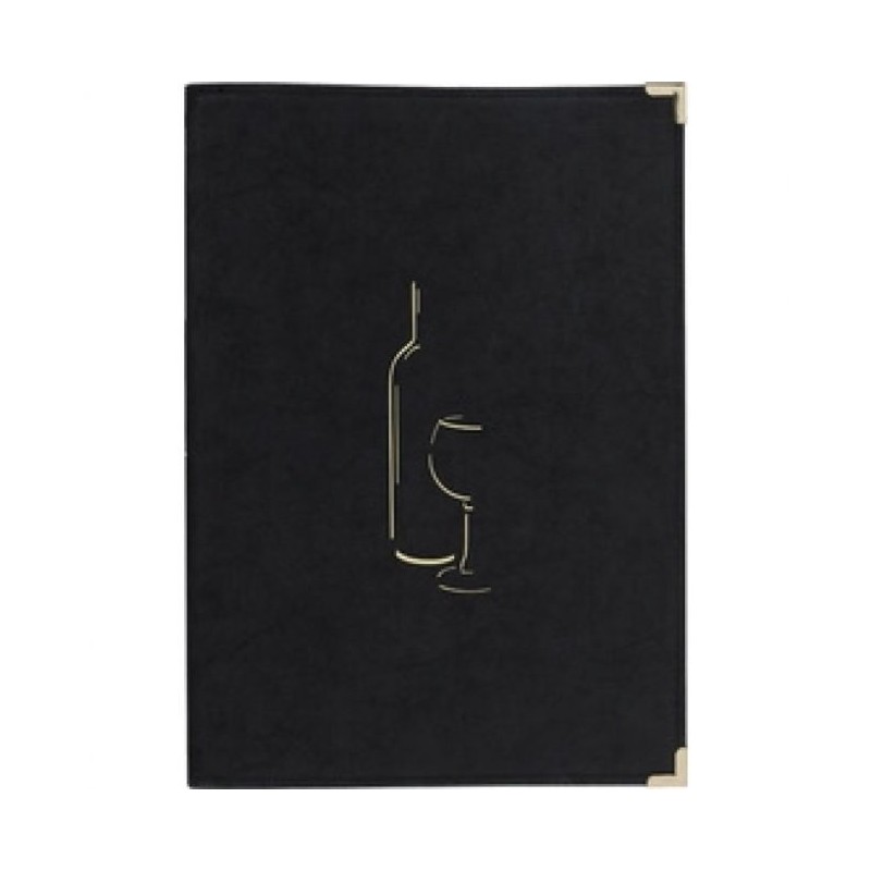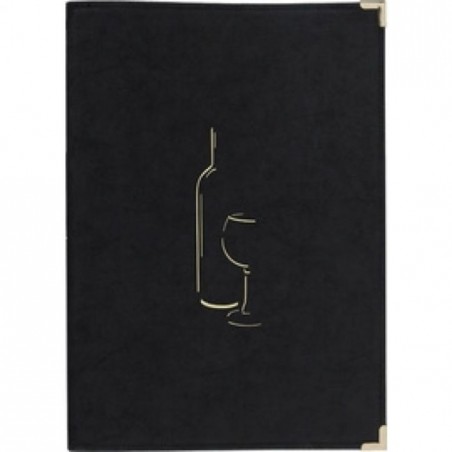 Cette carte des vins est en polyuréthane, ce qui évite le marquage de l'encre sur l'insert, avec en relief une bouteille et un verre de vin.Cette carte des vins A4 est de couleur noir en simili-cuir très résistant.