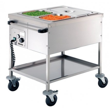 Le bain-marie chariot professionnel chauffe à sec avec une profondeur de cuve de 200 mm. Le chariot bain-marie avec roulettes est pratique pour le service et le maintien de vos préparations au chaud.