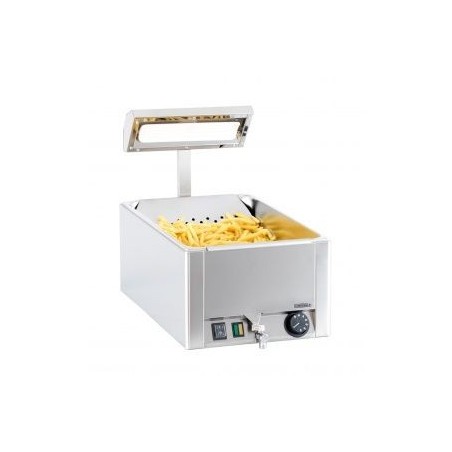 Ce chauffe frites professionnel est facile à nettoyer grâce à son bâti tout en inox. Ce chauffe frites à poser a une capacité de GN 1/1 de 150 mm de profondeur. Idéal pour les professionnels qui veulent gagner du temps, le chauffe frites avec lampe à poser permet de garder les frites à bonne température. Ainsi, les restaurateurs peuvent continuer à faire cuire d'autres frites.