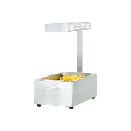 Ce chauffe-frites infrarouge est équipé d’une grille perforée amovible ce qui permettra d’éliminer toute la graisse et le sel afin d’obtenir des frites onctueuses.Le chauffe frites professionnel a aussi la possibilité de maintenir au chaud d’autres plats grâce à son bac GN1/1.Idéal pour les snacks et les restaurants, ce matériel est chauffé par une lampe infrarouge située en haut du bac.Pour une hygiène parfaite, un entretien facile et rapide cet appareil est équipé d'un revêtement en inox.