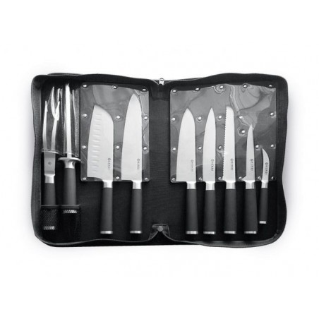 - Le set comprend: La fourchette à découper (320 mm), le fusil (340 mm), couteau Santoku (336 mm), Couteau chef (370mm et 330 mm), couteau à jambon/ saumon (331 mm), couteau à pain (333mm), couteau à décosser (285 mm), couteau d'office (193 mm)- Mallette en plastique- Manche profilé et sécurisé- 9 pièces