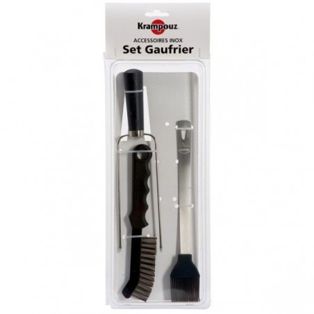 Le set d’accessoires pour gaufrier est composé d’un pic à gaufres, d’un pinceau en silicone pour graisser les fers et d’une brosse en inox pour nettoyer les fers.