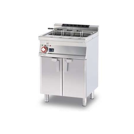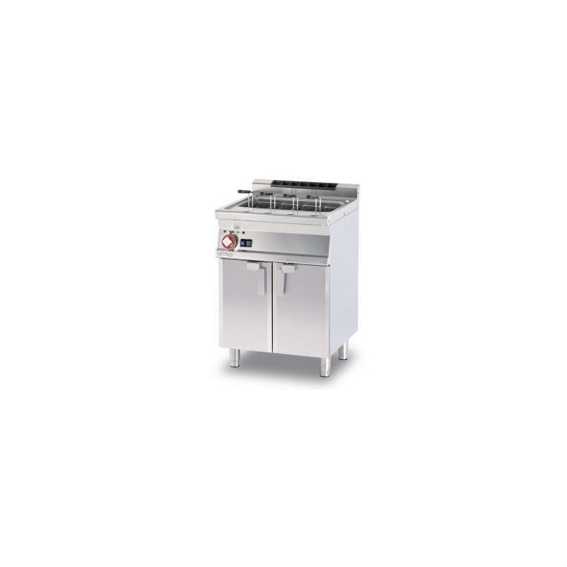 - Ce cuiseur à pâtes triphasé est équipé d'une cuve de 40 L, d'un système de chargement automatique de l'eau avec sensor de niveau, d'un trop plein et d'un système de vidange au sol.