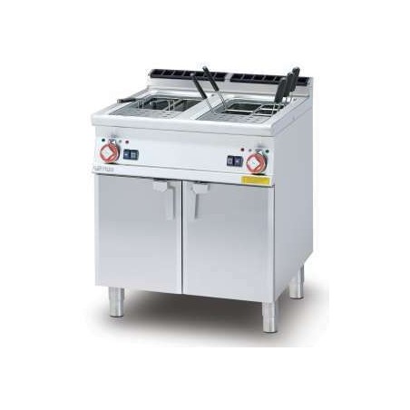 - Ce cuiseur à pâtes triphasé est équipé de deux cuves de 25 L, d'un système de chargement automatique de l'eau avec sensor de niveau, d'un trop plein et d'un système de vidange au sol.