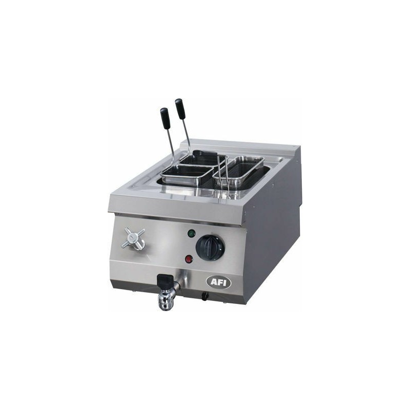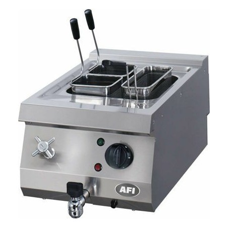 - Cuiseur à pâtes électrique avec une cuve de 20 litres pour un rendement maximum. Ce cuiseur à pâtes se compose d’une plage avant d’égouttage, de résistances blindées qui assurent une montée en température rapide et d’un robinet de vidange avec une valve de sécurité pour vider rapidement et sans danger chaque cuve de l’appareil. Il fonctionne de manière automatisée pour conserver la meilleure qualité d’eau de cuisson possible et est équipé de robinets eau chaude/eau froide pour le remplissage rapide et direct des cuves.