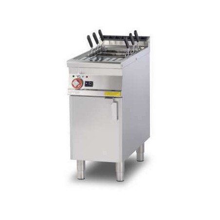 -Cuiseur à pâtes triphase équipé d'une cuve de 40L de 30.7x50.9x32.7H cm, d'un chargement automatique de l'eau avec sensor de niveau trop plein et d'un système de vidange au sol. (Paniers exclus).