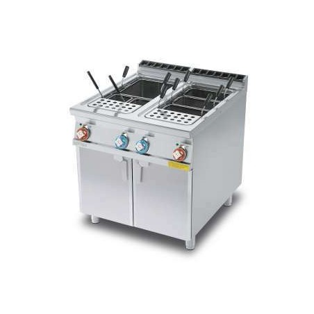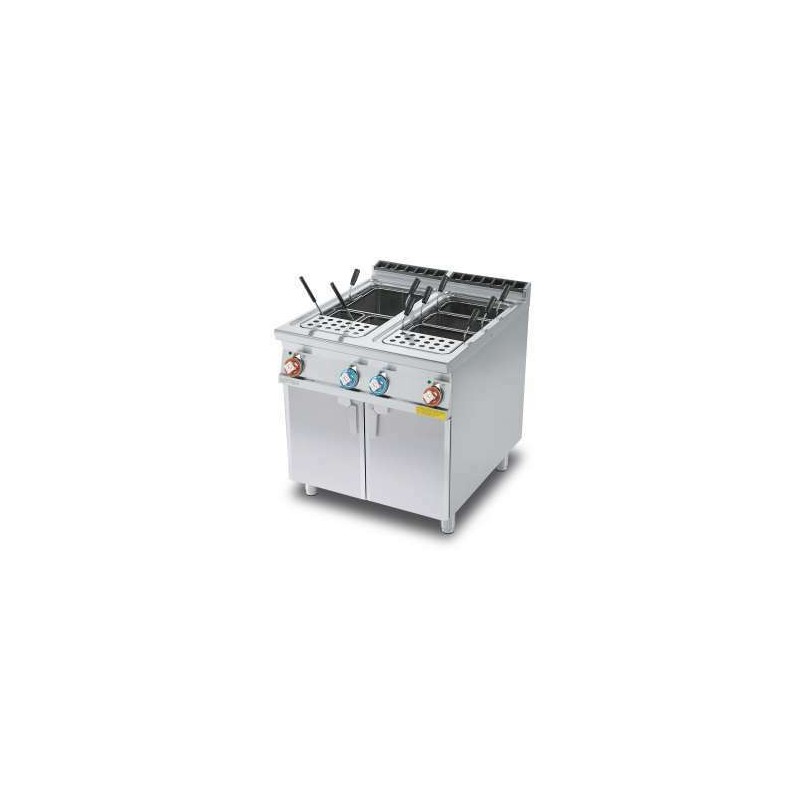 -Cuiseur à pâtes triphase équipé de 2 cuves de 40L de 30.7x50.9x32.7H cm, d'un robinet d'arrivée d'eau trop plein et d'un système de vidange au sol. (Paniers exclus).