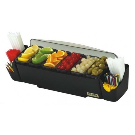 -En matière synthétique-Couleur noire-Avec couvercle ABS translucide breveté en coupole pivotant-Dimensions : L 592 x Larg 202 x H 200 mm-Composition : 6 bacs semi-profonds étroits (0,55 l), 2 supports pour pailles, 1 jeu de poignées-Volume : 3,30 litres