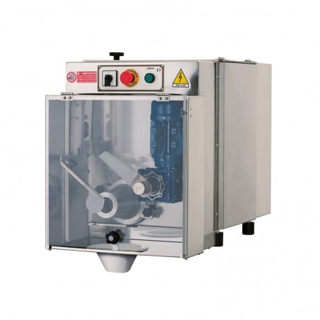 Il est possible d'introduire dans la partie supérieure (trémie) jusqu' 30 kg de pâte non levée à une température maximale comprise entre 15° et 20°C; pour un produit final meilleur, une pâte dure est conseillée. La machine n'est disponible qu'en 400V/50 hz monophasé.