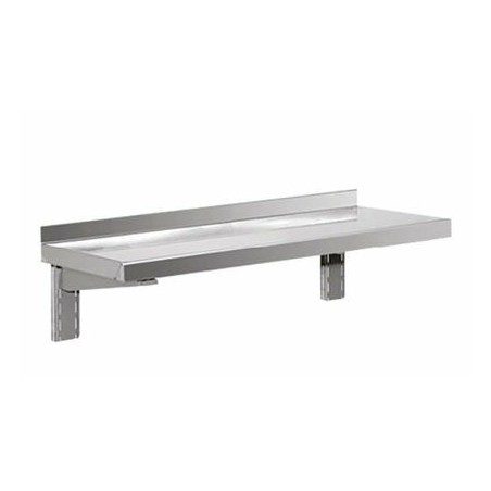 - Cette étagère murale simple d’une profondeur de 400 mm est constituée d’un bord arrière relevé. Sa construction est en inox 18/10. La tablette se pose sur des consoles réglables en hauteur, sur crémaillères ou sur consoles fixes.