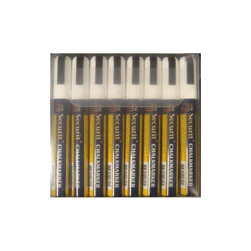 Lot de 8 Feutres blanc à craie 2-6 mm Securit effaçable à l'eau avec un chiffon humide.Utilisation sur : Ardoises murales, panneau trottoir, vitrines, miroirs, plastique, métal, tuiles, whiteboards et toutes autres surfaces non poreuses