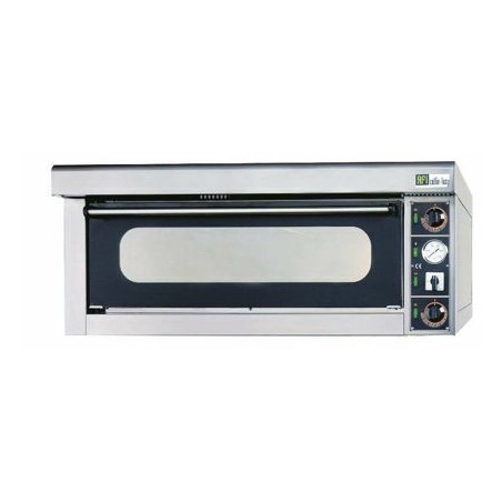 -Four à pizzas électrique avec chambre entièrement réfractaire. Ce four est constitué d’une cheminée d’évacuation des vapeurs de cuisson, d’une sole de four en pierre réfractaire, d’une porte vitrée et d’une carcasse en acier laqué brun. Sa façade est en inox et son isolation est renforcée.