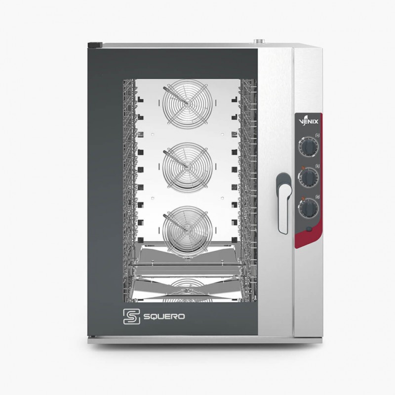Four 12 Niveaux GN 1/1 - SQ 12 M00 Série Gastronomy - Version Four Mixte Mécanique ou Digital 2 Turbines Système Vapeur - 2 Moteur Ventilateurs Distance entre les niveaux : 70 mm - Température : 30/280° C Puissance : 15.7 Kw - Voltage : 400 V/3/N - 50-60 Hz Porte Non Réversible. Dim Ext : L 937 x P 827 x H 1211 mm - Poids : 149 Kg Dim avec Emballage : L x P x H mm - Poids : Kg Nouvelle Référence du GC912M