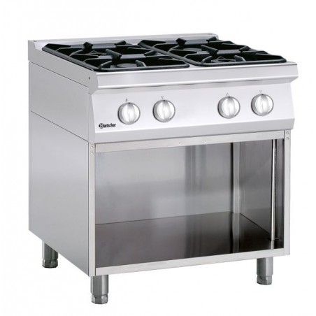 Ce fourneau professionnel ou cuisinière piano dispose de 4 feux vifs avec un soubassement ouvert.