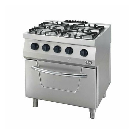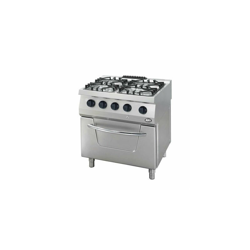 -Founeau 4 brûleurs gaz sur four gaz statique GN2/1 avec régulation par thermostat de 100 °C à 300 °C. Le four est conçu en acier inoxydable et est équipé de glissières chromées démontables permettant ainsi trois niveaux d’espacement. Sa porte de 40 mm d’épaisseur est équipée d’une poignée robuste et sure, isolée. Et les coins arrondis de ce fourneau facilitent le nettoyage. Les brûleurs en fonte améliorent la puissance et l’efficacité de la combustion et sont équipés d’une veilleuse et d’une sécurité par thermocouple. Les brûleurs du four sont micro-perforés en acier inoxydable afin de permettre une montée en température rapide de la chambre. Le design de la porte et de la chambre du four minimise la perte d’énergie et évite un transfert de chaleur important vers la partie haute et le panneau de commande du fourneau. Cela évite l’ajout d’une plaque de protection.
