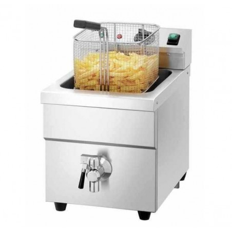 Cette friteuse est équipée d'un thermostat de sécurité, d'un robinet de vidange et est vendue avec un couvercle et une plaque perforée.