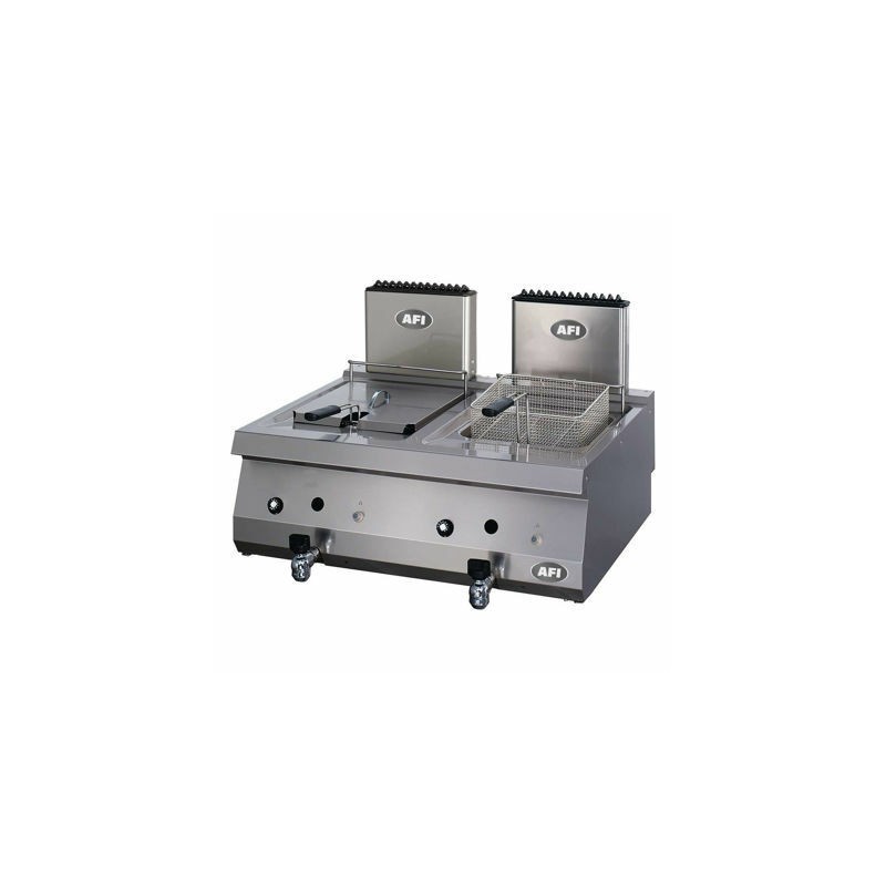 - Friteuse professionnelle gaz à poser. Cette friteuse est constituée d’une construction inox et de deux cuves embouties en inox 304 AISI d’une capacité de 12 litres chacune et avec une zone froide. Ces cuves se composent d’une seule pièce sans soudure ce qui facilite le nettoyage et garantit la meilleure hygiène possible. La cuve et la partie supérieure de l’appareil forment un dessus monobloc grâce à un assemblage robotisé sans soudure.