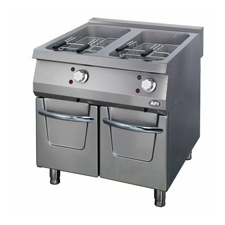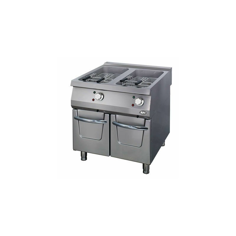 - Cette friteuse électrique avec construction inox est constituée de deux cuves embouties inox 304 AISI d’une capacité de 22 L chacune. Chaque cuve se compose d’une seule pièce sans soudure ce qui facilite le nettoyage. Elles sont également équipées d’une zone froide et forment avec la partie supérieure de l’appareil un dessus monobloc grâce à un assemblage robotisé sans soudure. La conception de l’appareil et le châssis entièrement en acier inoxydable confèrent à cette friteuse une excellente robustesse, gage d’une importante durée de vie. Le repositionnement des résistances permet une montée et un contrôle de la température plus rapide et plus efficace car l’ensemble du bloc de résistances est immergé dans l’huile. Le système de rotation de ce bloc de résistances permet d’accéder sans contrainte au fond de la cuve et facilite ainsi l’entretien et le nettoyage de l’appareil.