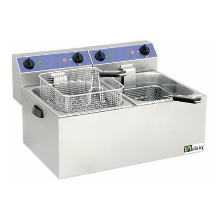 - Cette friteuse de table sans vidange est équipée d’une zone froide de décantation, d’un interrupteur de sécurité, de cuves amovibles, de paniers en fil chromé, de résistances amovibles pour faciliter l’entretien, d’un interrupteur et d’un témoin lumineux. Le contrôle thermostatique se fait grâce à un thermostat de sécurité à réarmement manuel.
