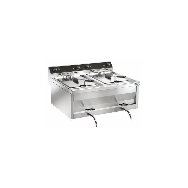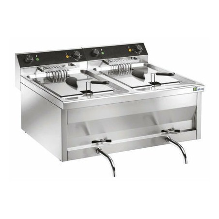 - Cette friteuse de table électrique avec cuve emboutie, est équipée d’un robinet de vidange, d’un relais de puissance et de témoins lumineux de fonctionnement. Le contrôle thermostatique se fait grâce à un thermostat de sécurité à réarmement manuel.