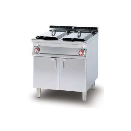 - Cette friteuse triphasée est équipée de deux cuves de 13 L avec couvercles, de deux paniers, de deux filtres et de deux bacs de récupération de l'huile avec filtres. Elle peut produire jusqu'à 20 kg de pommes frites par heure.
