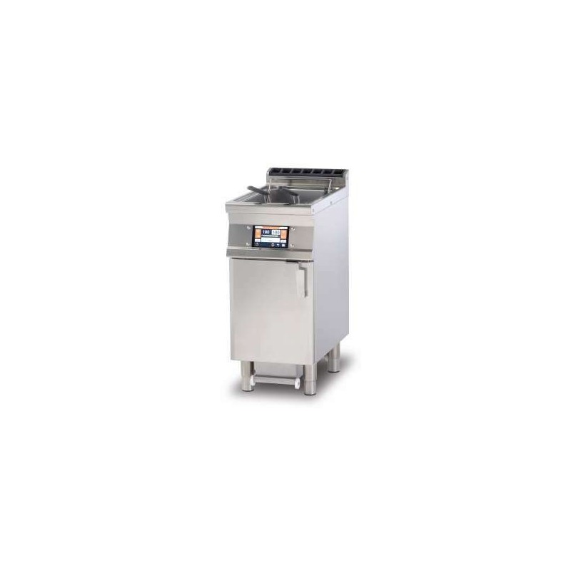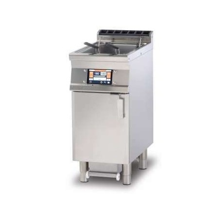 - Cette friteuse électrique est équipée d'une cuve de 18 L avec couvercle, de deux paniers, d'un filtre et d'une bassine de collecte de l'huile avec support sur roues. Elle possède un écran tactile de 7'' et peut enregistrer jusqu'à 100 programmes en mémoire. Elle a également un capteur de présence et de niveau maximal d'huile et conserve la nourriture à 110°C ou propose un pré-traitement à 160°C avec ou sans melting.