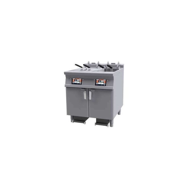 - Cette friteuse électrique est équipée de deux cuves de 18 L avec couvercles, de quatre paniers, de deux filtres et de deux bassines de collecte de l'huile avec support sur roues et filtre 5 microns. Elle possède un écran tactile de 7'' et peut enregistrer jusqu'à 100 programmes en mémoire. Elle a également un capteur de présence et de niveau maximal d'huile et conserve la nourriture à 110°C ou propose un pré-traitement à 160°C avec ou sans melting.