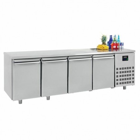 - Cette table réfrigérée est équipée de 4 portes, 2 grilles, de 8 paires de guide et d'un système de décongélation automatique. Sa température ambiante maximale est de 43°C. L'épaisseur d'isolation de cette table réfrigérée est de 50 mm.