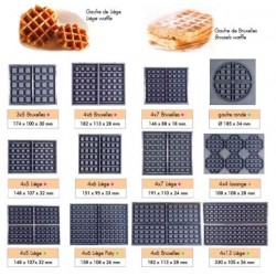 | Empreinte | Format gaufres | Nbre de gaufres | Puissance | Poids | Encombrement* | Code | ||