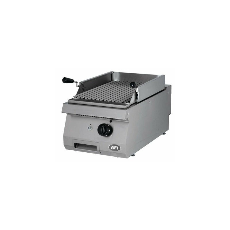 - Grill gaz sur pierre de lave à poser, avec un tiroir de récupération du jus de cuisson situé en façade pour être facilement accessible. Ce grill est constitué de 2 ou 4 brûleurs en acier inoxydable micro perforés à haut rendement pour assurer une montée en température rapide et homogène. Le dessin en « V » de la grille de cuisson permet un drainage efficace du jus de cuisson et des graisses jusqu’au tiroir de récupération amovible. La grille est ajustable en hauteur pour un meilleur contrôle de la cuisson. Elle est également facilement démontable et nettoyable au lave-vaisselle.