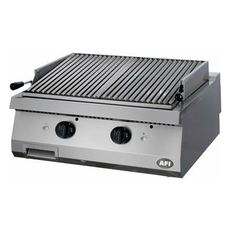 - Grill gaz sur pierre de lave à poser, avec un tiroir de récupération du jus de cuisson situé en façade pour être facilement accessible. Ce grill est constitué de 2 ou 4 brûleurs en acier inoxydable micro perforés à haut rendement pour assurer une montée en température rapide et homogène. Le dessin en « V » de la grille de cuisson permet un drainage efficace du jus de cuisson et des graisses jusqu’au tiroir de récupération amovible. La grille est ajustable en hauteur pour un meilleur contrôle de la cuisson. Elle est également facilement démontable et nettoyable au lave-vaisselle.