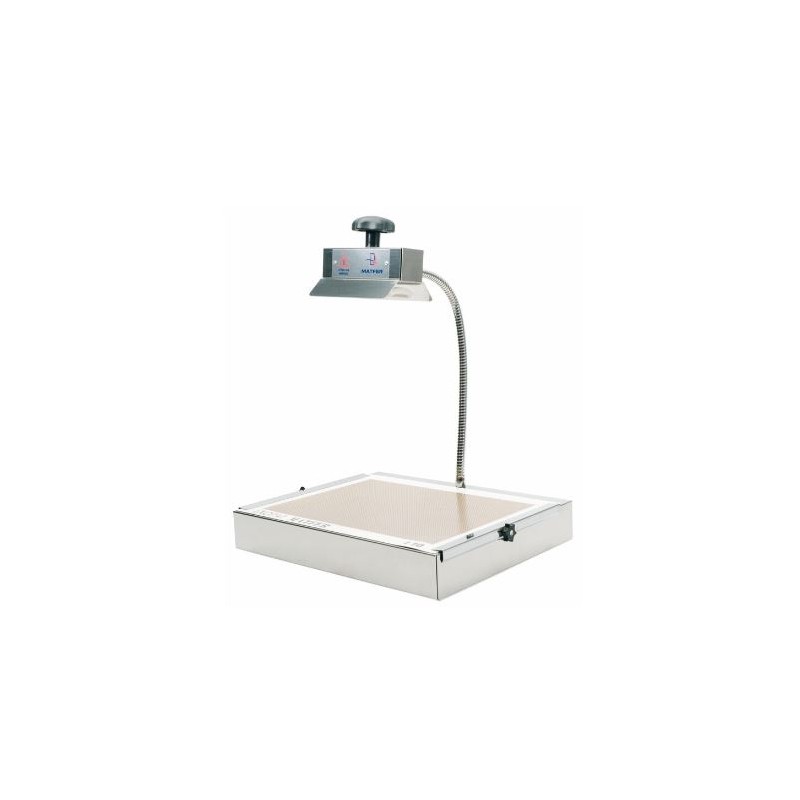 Pour le fonctionnement de la lampe à sucre, un interrupteur marche/arrêt avec voyant lumineux de mise sous tension est placé sur un côté. La lampe à sucre 500 watts est doté d'un chauffage par lampe céramique très résistante. Afin de faciliter le réglage de la hauteur de la lampe céramique en fonction de la chaleur recherchée, la lampe à sucre professionnelle est montée sur un flexible. La lampe à sucre professionnelle est équipée d'un plan de travail en acier inoxydable avec un tapis anti-adhésif interchangeable.