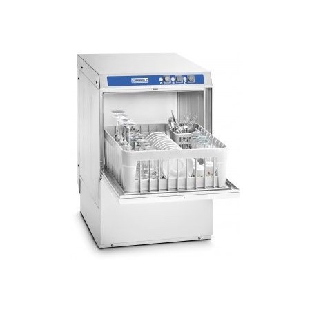 - Châssis et paroi : Inox AISI 18/10- Bras de lavage et de rinçage en inox : Oui- Contact de sécurité-porte : Oui- Porte double paroi : Oui- Résistance de cuve et surchauffeur : Incoly 800- Rendement : 30 casiers par heure- Panier : 400 x 400 mm- Alimentation électrique : 230 V / 50 Hz- Résistance de la cuve : 1 300 W- Résistance du surchauffeur : 3 000 W- Doseur pour liquide de rinçage : Oui- Protection contre la marche à sec : Oui- Consommation d'eau : 3 litres- Contenance de la cuve : 14 litres- Raccord pour l'eau : G3/4M- Ecoulement : ø 28 mm- Dotation : 2 paniers- Durée de cycle : 120 secondes- Puissance : 3 300 W- Dimensions : L 468 x P 510 x H 714 mm- Poids : 40 Kg