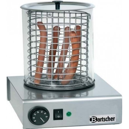 L'appareil à hot dog professionnel électrique en inox est équipé d'un cylindre en verre, pouvant contenir environ 30 saucisses et possède un thermostat réglable pour pouvoir les chauffer.