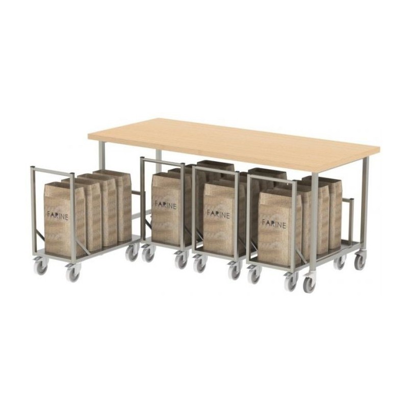 La table de boulangerie est fabriquée en inox avec le dessus en hêtre d'une épaisseur de 42 mm. Cette table professionnelle est équipée de 4 roulettes dont 2 avec frein, ainsi elle est très maniable. Les chariots porte-sacs à farine sont conçus en inox avec 4 roulettes et 2 avec frein. Ces chariots porte-sacs à farine peuvent servir pour stocker ou déplacer 4 sacs à farine de 40 kg chacun.
