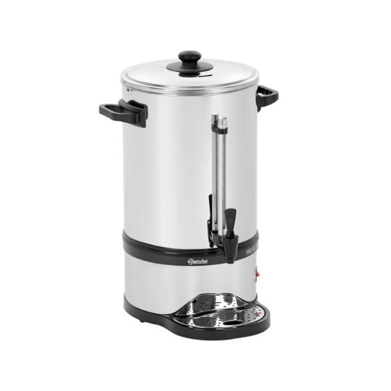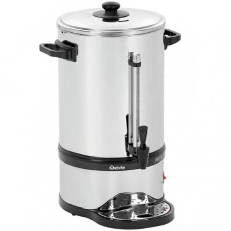 La machine à café a une contenance de 15 litres pour une quantité de percolation minimale 6 litres ce qui équivaut à 40 tasses.Cette machine à café, vous indiquera par un signal, le détartrage à effectuer.Un racloir de nettoyage est compris dans la machine à café Pro II.Vous pouvez utiliser cette machine à café avec ou sans filtre grâce au filtre optimisé en acier inoxydable.La machine à café Pro II électrique est munie de 2 systèmes de chauffage séparés pour la fonction de préparation et de maintient au chaud