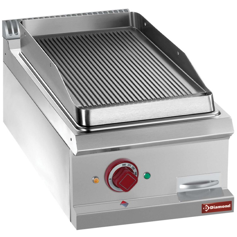 Plaque de cuisson en fonte (15 mm) à haute conductibilité thermique, inclinée en avant et munie d'un rebord anti-éclaboussures sur 3 côtés soudé (3 mm) en acier inox, parfaite étanchéité. Un tiroir de récupération du jus de cuisson est positionné sur la façade avant de l'appareil.