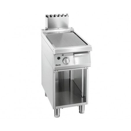 La plaque à snacker gaz sur soubassement est équipée d'une plaque de cuisson en acier rainurée.