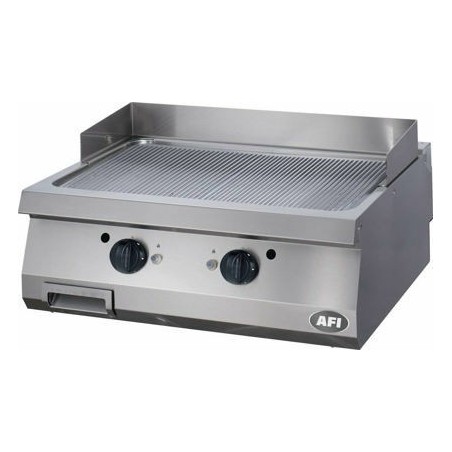 - Grill gaz à poser avec une plaque de cuisson nervurée en chrome avec finition satinée. Ce grill est constitué d’un tiroir de récupération du jus de cuisson d’une capacité de 1,5 litre, d’un pare-éclaboussure amovible et lavable en lave-vaisselle et de brûleurs équipés de thermocouple (gage de sécurité). Ces brûleurs en acier inoxydable avec contrôle thermostatique de 100°C à 300°C ont spécialement été étudiés pour fournir une chaleur homogène et garantissent une meilleure combustion. La conception de ce grill permet une restitution homogène de la chaleur sur toute la surface de cuisson.