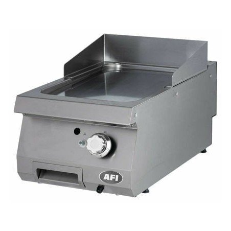 - Grill gaz à poser, avec une plaque de cuisson lisse en chrome de 15 mm en finition satinée. Ce grill est constitué d’un tiroir de récupération du jus de cuisson d’une capacité de 1,5 litre, d’un pare-éclaboussure amovible et lavable en lave-vaisselle et de brûleurs équipés de thermocouple (gage de sécurité). Ces brûleurs en acier inoxydable avec contrôle thermostatique de 100°C à 300°C ont spécialement été étudiés pour fournir une chaleur homogène et garantissent une meilleure combustion ainsi qu’une montée en température rapide. La conception de ce grill permet une restitution homogène de la chaleur sur toute la surface de cuisson.