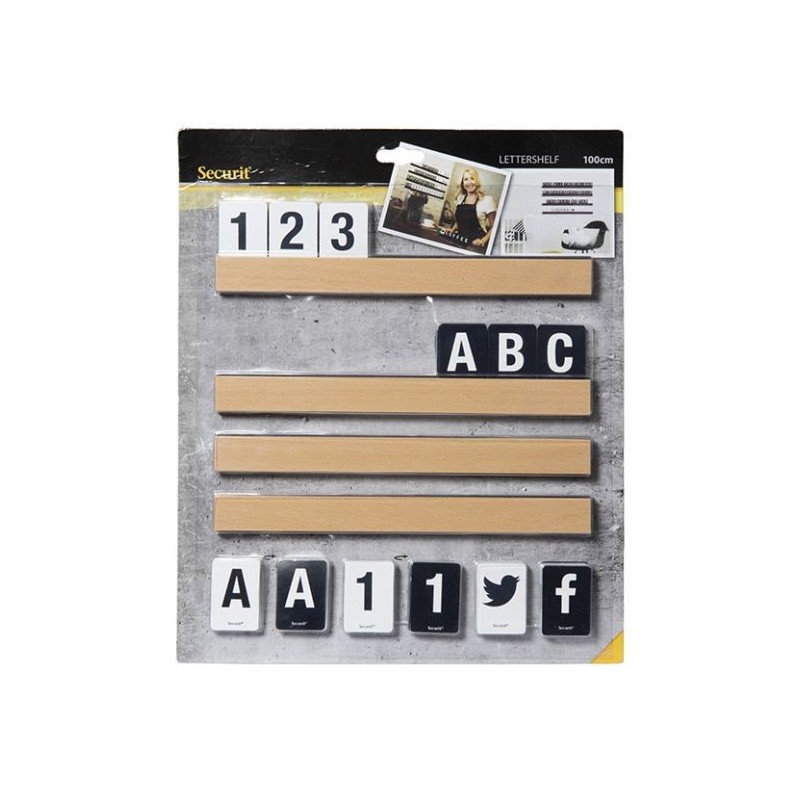 Ce kit composé de 4 étagères en bois et de lettres, chiffres et symboles vous permet d'afficher au mur des messages.Les lettres, chiffres et symboles fournis peuvent se mettre de 2 côtés différents : 1 blanc et 1 noir.Les étagères se fixent grâce à du scotch double face très résistant.